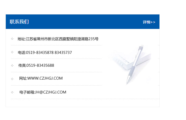 地址:常州市新北區友邦商務大廈1幢16、17層  電話:0519-85101652  傳真:0519-85112595  郵編:213022  網址:www_cz-jiayue_cn.yuanliip.com  郵箱:xiajifengaa@163.com